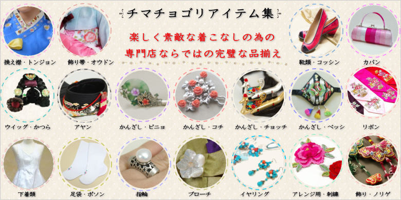 専門店ならではのチョゴリアイテムも豊富な品揃え。美しく正統派の着こなしには小物も大切ですね。必需品のウィッグの他、華やかなピニョ・コチ・チョッチ・テンギ・アヤン等多数ご用意しています!