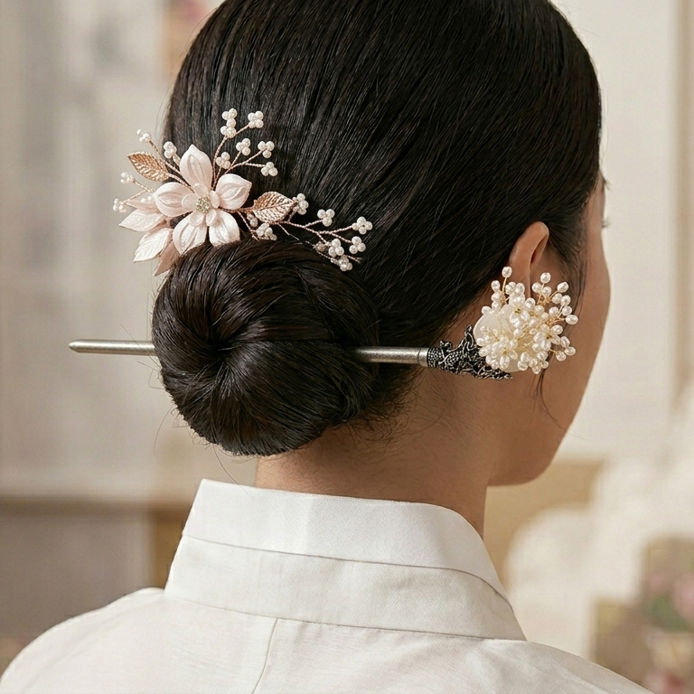 - こだわり: ピニョ、コチを差すことで横顔まで完璧な仕上がりになります。このスタイルは首筋をすっきりと見せ、チマチョゴリの美しい襟元を際立たせる効果があります。専門店としての経験から、ピニョの差し方一つで全体の品格が変わることをお伝えしています。