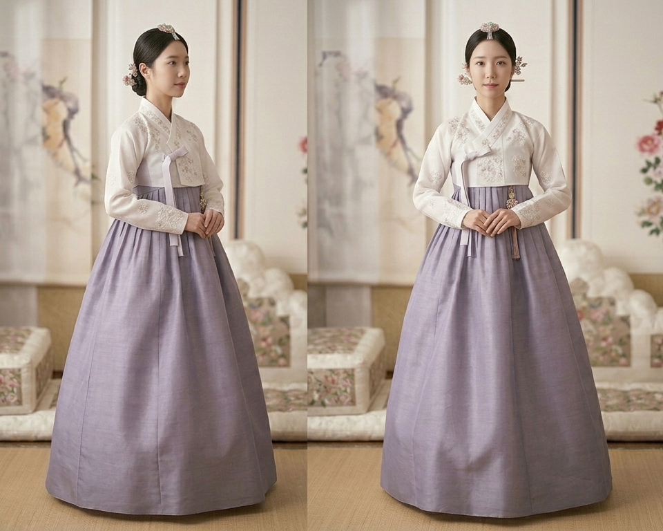 お衣装のサイズ選びにおいて「身長」が最も重要であるのと同様に、髪型は「全身のシルエット」を左右します。チマ(スカート)にボリュームがあるため、髪型をコンパクトに、または重心を上げることで、スタイルをより美しく、背を高く見せる効果があります。