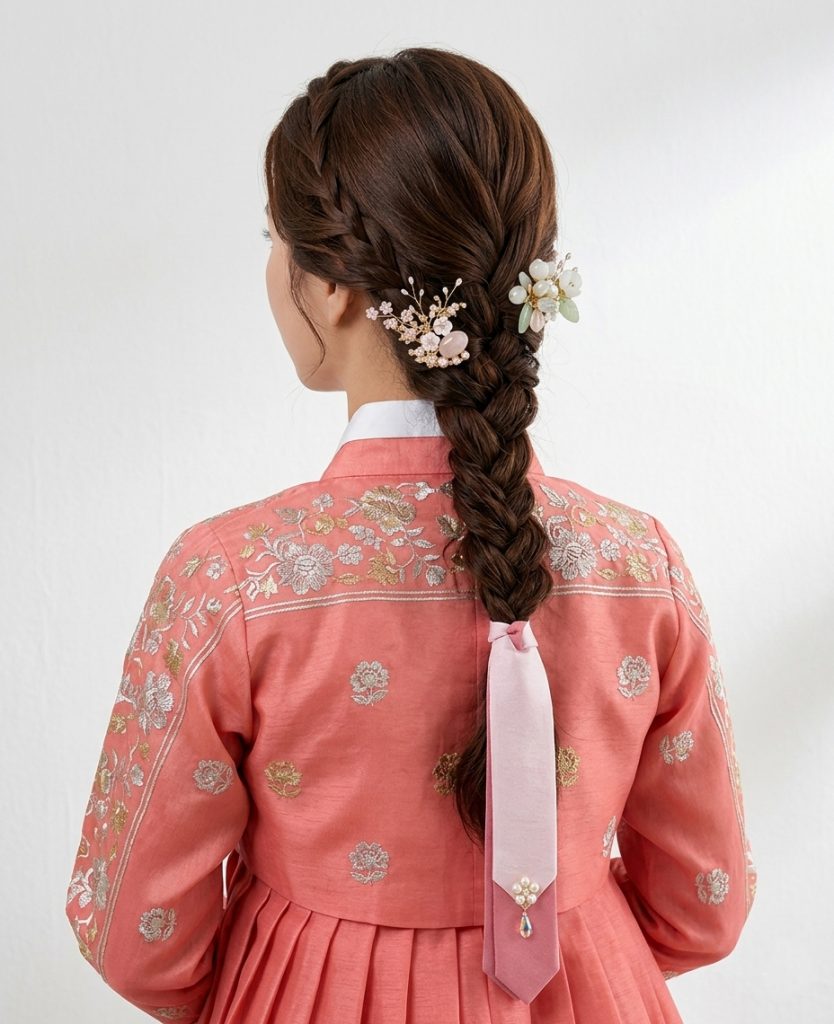 - 髪飾りの合わせ方: 柔らかく編みおろした髪の先に、衣装の色と合わせたリボンである「テンギ」を結びます。編み込みの途中に小さな花のコチを散らして、ロマンチックに仕上げるのがトレンドです。