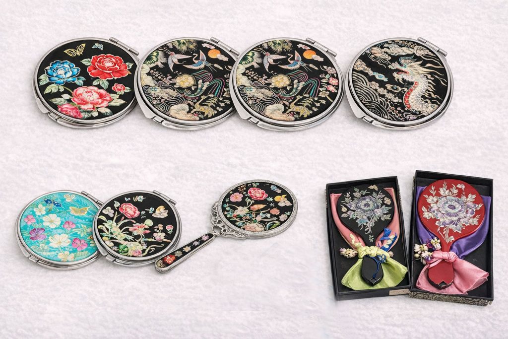 韓国のお土産や贈り物として人気の「韓国螺鈿(らでん)の手鏡」。 見た目の華やかさだけでなく、「柄に意味を込めて選べること」や「実用品として使いやすいこと」から、幅広い年代に喜ばれる定番のギフトアイテムです。